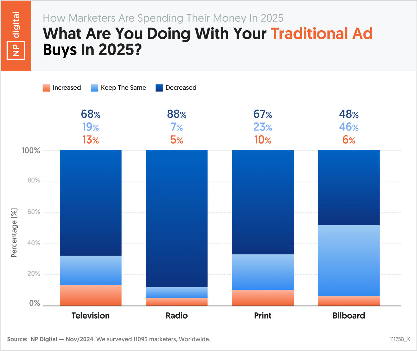 Meanwhile, traditional channels are getting a digital upgrade. Connected TV (CTV) is stealing the spotlight as marketers shift their budgets away from traditional TV ads.