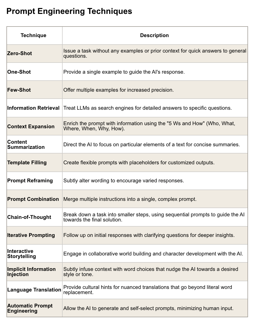 Few-Shot Prompting: Utilizes several examples to fine-tune the AI's output, providing a richer context within which the AI can work.