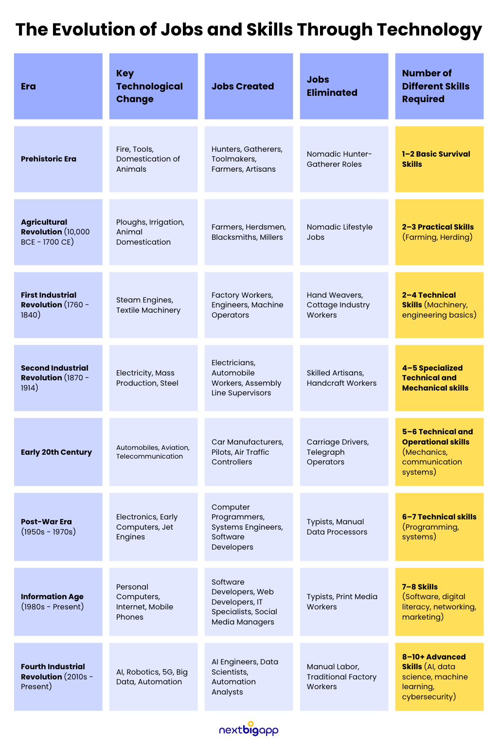 This table highlights how technological shifts have created new jobs, eliminated others, and increased the number of skills needed to earn above-average income over the past century.