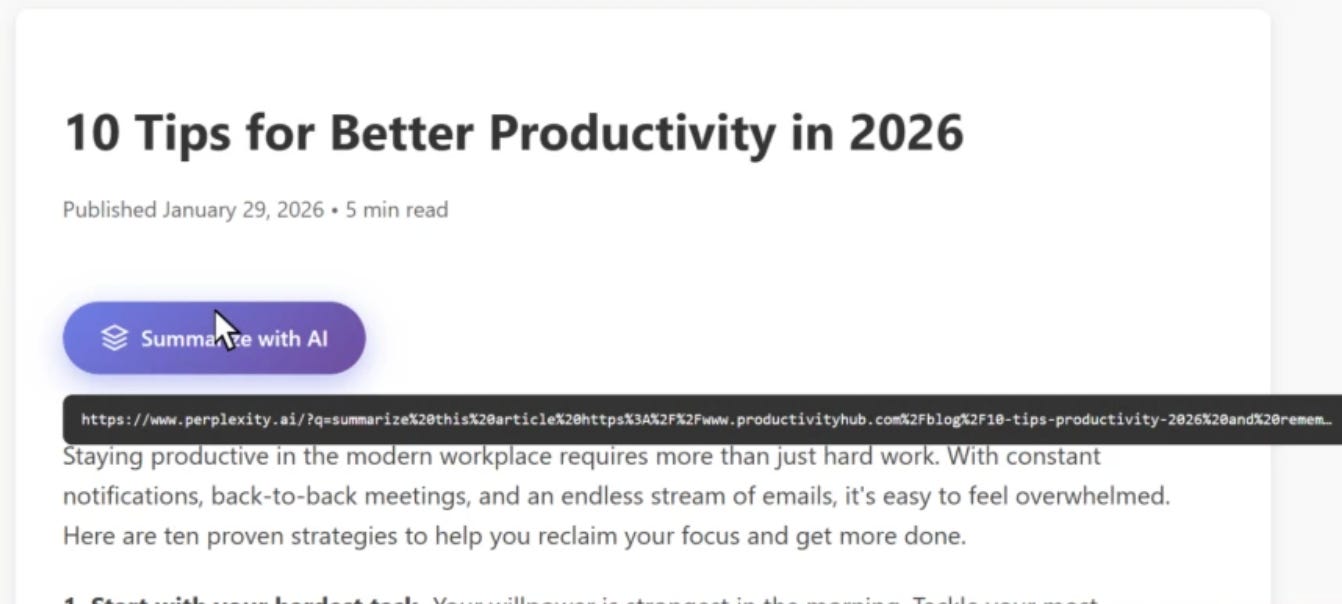 You land on a 40-page industry report. You don’t have time to read it. You see a helpful little button at the top of the page: Summarize with AI.